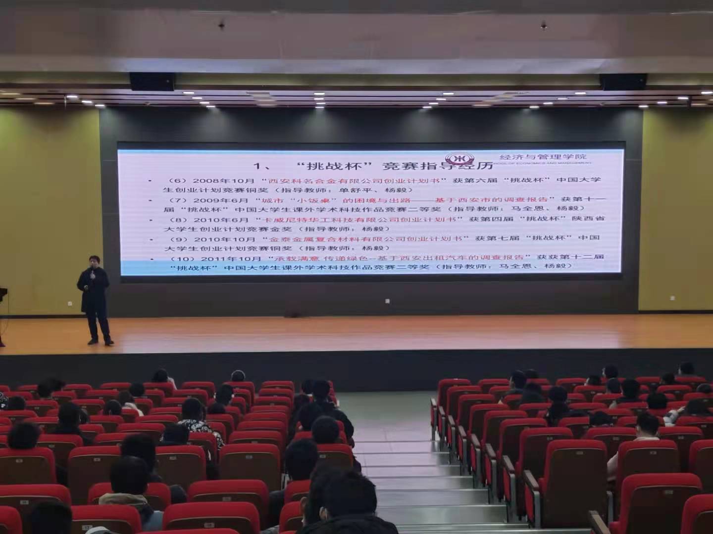 杨毅副教授为同学们介绍了与“挑战杯”竞赛、大创项目以及“互联网+”大赛的相关内容。大会上,他强调,在创新创业活动过程中,青年人需要具备极强的家国情怀和社会责任感,鼓励同学们要不断实践、在实践过程中实现自我。