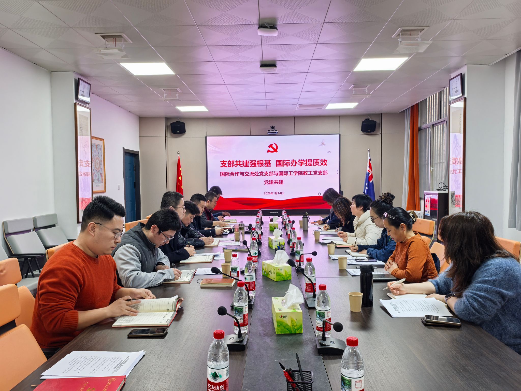 为深入学习贯彻党的二十届四中全会精神,深化党建与业务工作深度融合,凝聚国际化办学发展合力,1月14日上午,国际合作与交流处党支部与公司教工党支部在教三楼207会议室开展支部共建活动。活动由国际合作与交流处党支部书记杨媛主持。