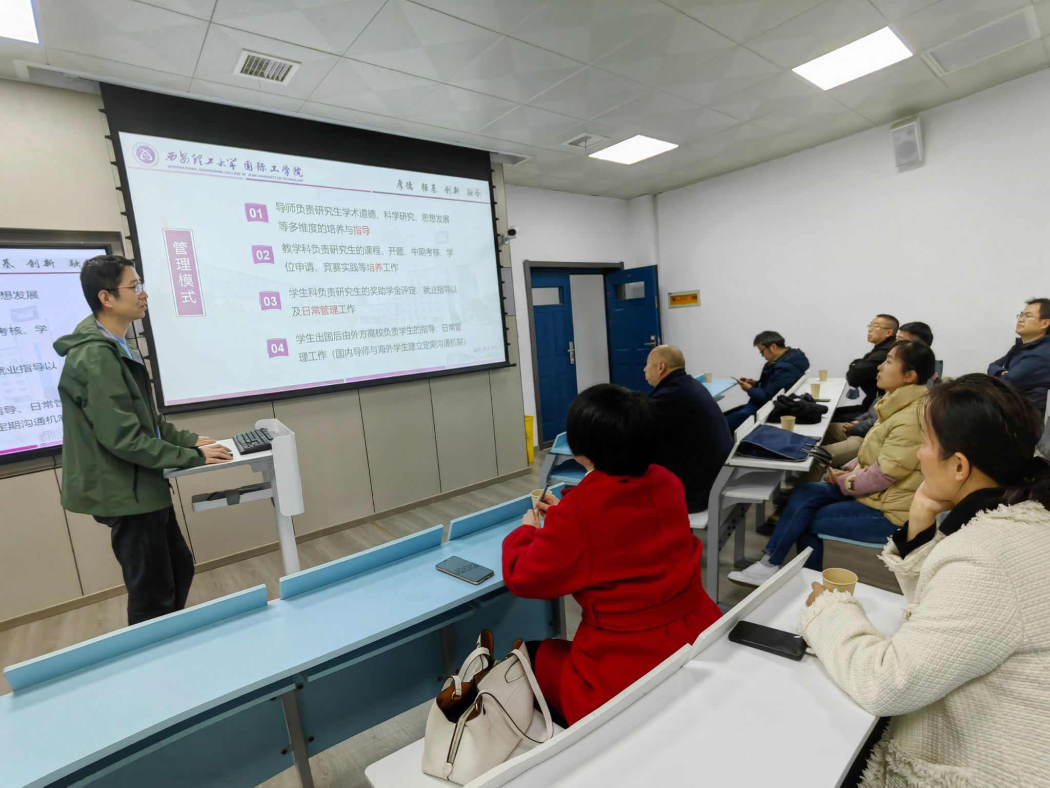 会上,刘永对中外联合培养研究生情况进行了全面介绍,特别针对培养模式、学分要求、培养环节、实践以及学位论文等关键环节进行了深入解读。他强调,为应对外方高校学期改制问题,希望各位导师要充分了解联合培养研究生的特点,适时为员工提供人文关怀和心理支持,并建议从研一开始提前指导研究生开展课题研究工作,助力研究生高质量完成学业和科研任务。