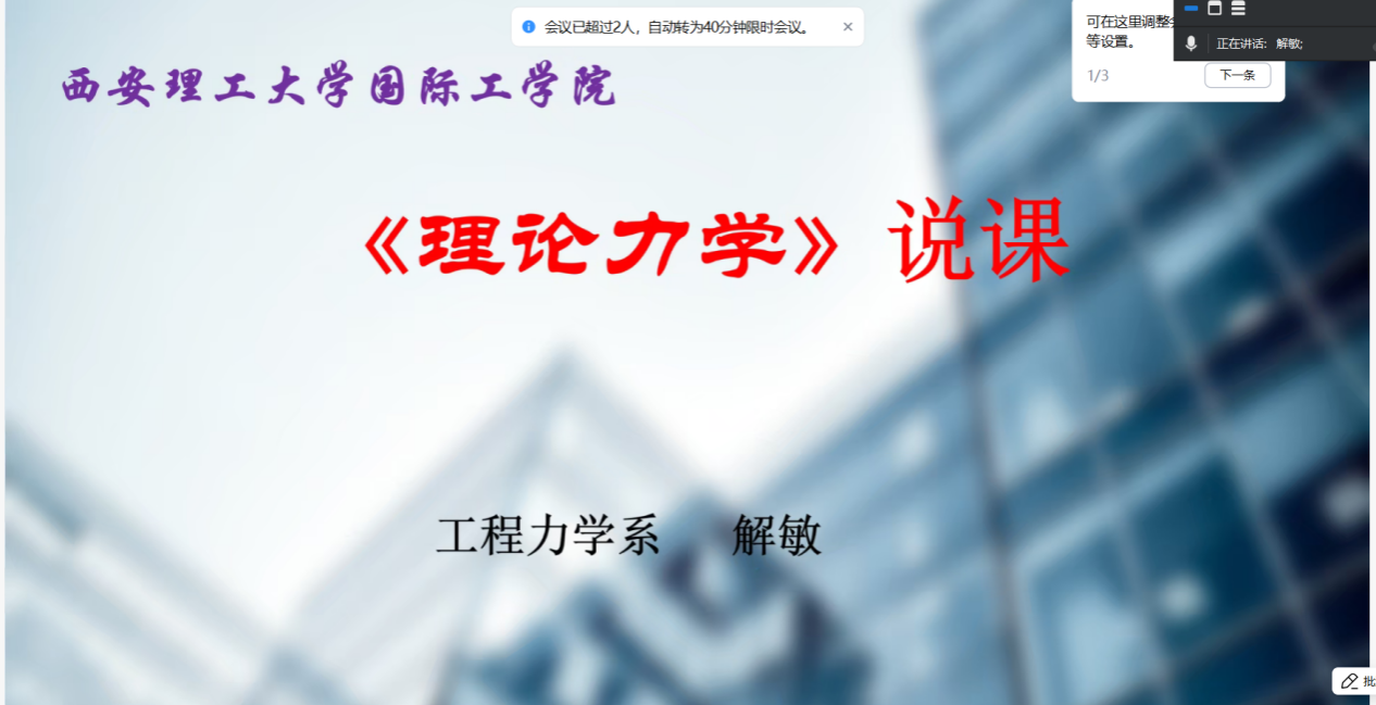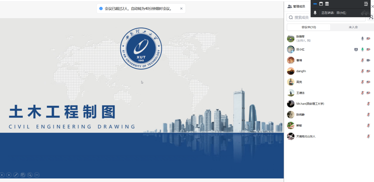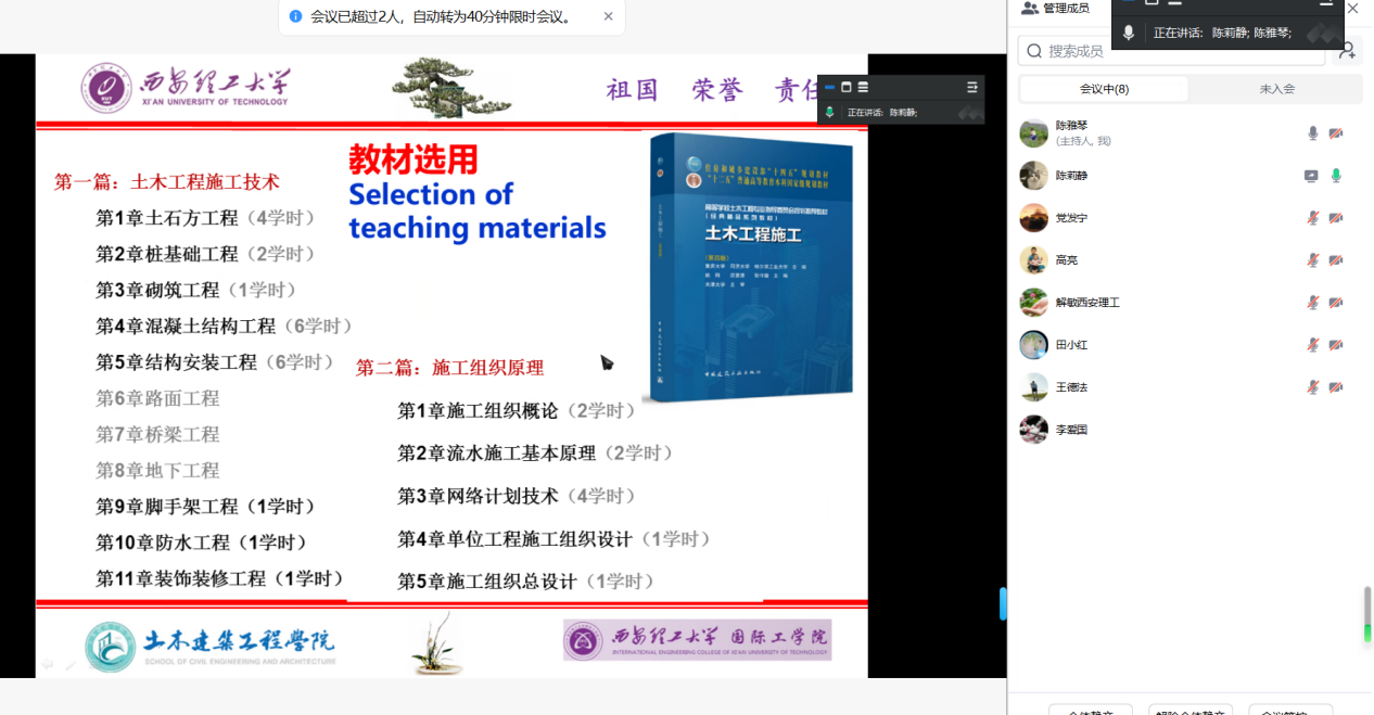 为进一步深化课堂教学改革,落实新课标理念,搭建教师专业成长与经验交流的优质平台,土木工程专业于9月2日下午召开2025年秋季学期线上说课交流会,出席本次说课交流会的有土木工程专业负责人党发宁教授、土建公司王德法教授及任课教师韩群柱、陈莉静、田小红、李爱国、解敏、高亮等,会议由土木工程专业秘书陈雅琴主持。